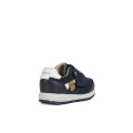 Deportivo Alben de Geox modelo B043CE en color marino para niño. Corte realizado en serraje con grabado de gato en el velcro, forro interior textil con plantilla extraíble de piel libre de cromo y antibacteriana que podrás limpiar facilmente, cierre mediante velcro ajustable y suela de goma que combina la suela perforada con la membrana impermeable que permite la regulación natural de la temperatura.