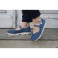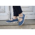 Mercedes serigrafiada On Foot en color marino modelo 30002. El corte es de piel natural con la pala serigrafiada a modo decorativo, forro interior de piel con plantilla extraíble, cierre mediante velcro ajustable y suela de goma flexible muy adherente. Fabricación española.