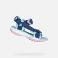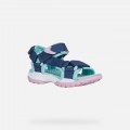 Sandalia para niña Borealis de Geox modelo J720WA en color marino- agua. El corte consiste en varias tiras de material textil ajustables con velcro resistentes al agua de rápido secado y durables, la suela es de goma flexible y adherente. La plantilla es de EVA, asegura amortiguación y aumenta la ligereza.