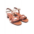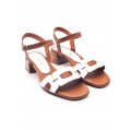 Sandalia de tacón D'Chicas modelo 3869 en color blanco. El corte es de piel, combina el blanco con cuero y detalles metálicos, forro interior de piel con plantillla acolchada, pulsera en el tobillo con cierre de hebilla lateral, tacón medio con una altura de 5 cm.