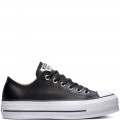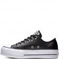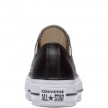Zapatilla de piel Converse Chuck Taylor All Star Lift Clean Leather Low Top modelo 561681C en color negro, corte realizado en piel lisa y resistente, incluso la etiqueta en el topo de la lengüeta con el nombre del modelo, refuerzo de goma en la puntera, forro interior de lona suave beige con plantilla acolchada, suela de goma antideslizante, cierre mediante cordones.