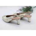 Zapato de fiesta Pomares modelo PO479 en color oro. Corte en piel con puntera abierta y destalonado en acabado satinado, forro interior de piel muy transpirable, tacón ancho de 7.5cm, suela sintética muy ligera y adherente. Un modelo elegante y sofisticado para llevar en tus fiestas y celebraciones de este verano.