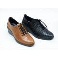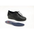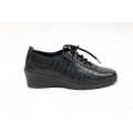 Zapato con cuña Notton modelo 136 en color negro o líbano. Corte realizado en piel natural con grabado cocodrilo, forro interior de piel con doble plantilla extraíble, puedes usar una o las dos en función de tu necesidad, cierre mediante cordones y suela sintética muy ligera con cuña de 5.5cm. Fabricación española.