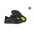 Zapato de piel Ecco Exostride modelo 835304 en color negro. Corte realizado en piel con cosidos en la pala, forro de Gore-Tex con plantilla extraíble para una mejor limpieza e higiene, cierre mediante cordones y suela de goma muy adhernete con la innovadora tecnología Ecco Shock Thru que ofrece absorción de impactos con cada paso.