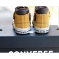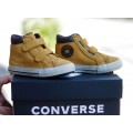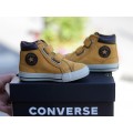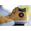 Bota Converse modelo 766395C en color mostaza para niño, realizadas en ante con cuello acolchado y detalles inspirados en excursionistas, forro interior de gamuza que aporta suavidad y calidez al pie, cierre mediante dos velcros ajustables y suela de goma flexible y adherente.