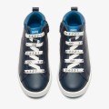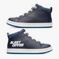 Botín Twins de Camper modelo K900254 en color azul para niño. Corte realizado en piel natural con puntera redondeada y lengüeta posterior para faciliar el calce, forro interior textil, cierre mediante cremallero y cordón, suela de goma cosida muy adherente para evitar resbalones.