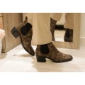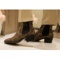 Botín de caña media-baja elaborado en piel vacuna de Hobby modelo 801 en color verde o negro con acabado en serraje manchado. Diseño cow con tacón cubano y acabado en punta, con elásticos laterales para un mejor calce. Planta y forro realizados en piel. Producto artesanal fabricado en España.