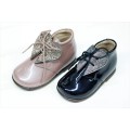 Botita de charol Beberlis modelo 21768 en color nude o marino para niña. Corte realizado en piel charol con detalle de solapa glitter en la cordonera, forro interior de piel suave y muy transpirable, cierre mediante cordones y suela de goma muy adherente y flexible para facilitar los primeros pasos. Una bota de fabricación española realizada con materiales de primera calidad.