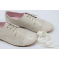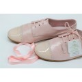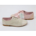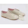 Blucher para niña Pirufin modelo 11358 en color rosa o beige. Corte realizado en piel con acabado afelpado brillante, la puntera y talón son de charol, forro interior de piel natural con plantilla anatómica libre de productos tóxicos, cierre mediante cordón y suela sintética muy flexible que ayuda a preservar el movimiento natural del pie.