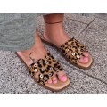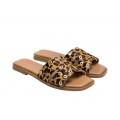 Corte realizado en piel natural con detalle de tachuelas y estampado animal print, plantilla acolchada de piel para buena transpiración y suela sintética antideslizante. Hecho es España.