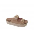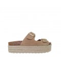 Corte realizado en piel serraje con detalle de hebillas en las tiras, plantilla de corcho forrada en piel natural que ofrece una excelente transpiración y suavidad, plataforma de yute con una altura de 5cm, la suela es sintética muy adherente.