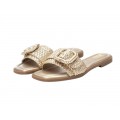 Fabricada en material textil con acabado metalizado trenzado y detalle de hebilla, suela de goma antideslizante.