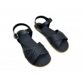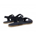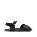 Corte fabricado en piel natural con una puntera redonda y lo suficientemente ancha para que no oprima los dedos, diseño de tiras cruzadas en la pala con acabado trenzado, forro interior de piel, drop cero (la altura del zapato es igual desde la puntera al talón), cierre mediante velcro ajustable, suela muy fina y flexible para permitir la total libertad de movimiento del pie.