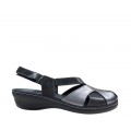 Corte realizado en combinación de piel natural negro nacarada con fantasia, forro interior de piel con plantilla extraíble, anatómica y lavable en piel, piso París con una altura aprox. de 3.5 cms.