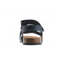 El corte está fabricado con materiales reciclados con mínimo impacto ambiental certificado por Global Recycled Standard 4.0, la tira del empeine está equipada con hebilla ajustable, forro textil muy transpirable, plantilla fisiológica de corcho, cierre mediante hebilla, el piso es de goma muy flexible y adherente. Hecho en España.