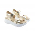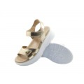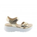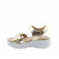 Corte fabricado en piel napa shine oro con ajuste de velcro en la tira del empeine, plantilla de piel anatómica muy confortable, cierre mediante velcro con pulsera de piel en el tobillo para un buena sujeción, suela de poliuretano, ligero, flexible, resistente y adherente. Altura de la plataforma 6.5 cm.