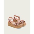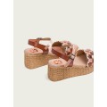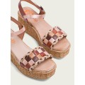 Sandalia de piel Porronet modelo 2729 en color cuero. La pala está formada por piezas de piel cuadradas en color cuero y metalizado rosé combinadas con tiras trenzadas de yute y piel, forro de piel con plantilla acolchada, cierre con tiras de piel combinadas de color blanco y metalizado plata y hebilla metálica lateral ajustable. Cuña con acabado mimbre de 6,5cm de alto y 3cm de plataforma, suela sintética muy ligera.