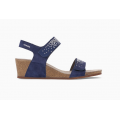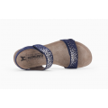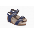 Sandalia de cuña Mephisto modelo Maria en color azul indigo. Corte realizado en cuero velour con detalle de apliques brillantes en las tiras, forro de piel con plantilla de corcho 100%natural con tecnología Soft-Air integrada, cierre mediante velcro ajustable en el empeine, de forma que permite ajustar el ancho a las necesidades de tu pie, la suela de caucho 100% natural amortigua de manera óptima los impactos de la banda de rodamiento, altura de la cuña 4cm.