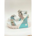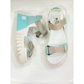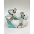 Corte realizado en piel natural con tira en el empeine con ajuste de velcro, forro interior en material textil muy transpirable, cierre mediante velcro a la altura del tobillo, cuña de 6 cm y plataforma de 3.5 cm, la suela es de material sintético muy adherente y ligera. Fabricación española.
