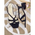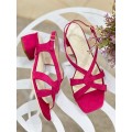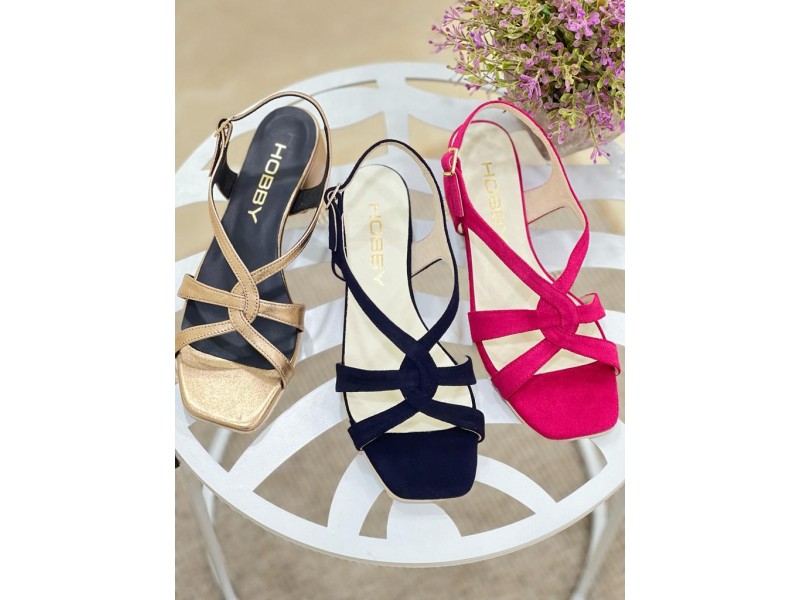 Sandalia para vestir con tacón de la marca Hobby 704 en color oro, marino, fucsia para mujer. Corte realizado en ante para el color marino y fucsia y en piel satinada para el color oro, forro interior de piel con plantilla acolchada, cierre mediante hebilla a la altura del tobillo, tacón ancho de 5 cm y suela sintética muy ligera y flexible.