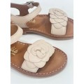 Corte realizado en piel natural con detalle de flor en la tira del empeine, forro y plantilla interior de piel con pulsera en el tobillo y cierre de hebilla para una buena sujeción al caminar, la suela es de material sintético para un buen ajuste y adherencia.
