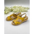 Sandalia de cuña Suave by Leyland modelo 3251 en color beige o amarillo para mujer. Un modelo perfecto para los pies más delicados ya que dispone de una horma amplia y están fabicados en piel natural de tacto muy suave que proporciona una excelente transpiración además la plantilla es extraíble lo que te permite colocar otra ortopédica en caso de ser necesario. No lo dudes, compra la tuya y disfruta de un confort absoluto todo el verano.