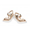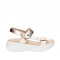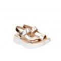 Corte fabricado en piel napa shine waterproof oro con ajuste de velcro en la tira del empeine, plantilla de piel anatómica muy confortable, cierre mediante velcro con pulsera de piel en el tobillo para un buena sujeción, suela de poliuretano, ligero, flexible, resistente y adherente. Altura de la plataforma 5 cm.