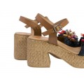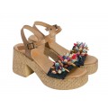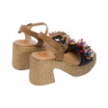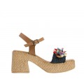 Pala fabricada en material textil con detalle de abalorios multicolor, plantilla acolchada de piel muy confortable con buena transpiración, cierre mediante pulsera de piel con hebilla ajustable que ofrece una buena sujeción, tacón de 8 cm y plataforma de 3 cm con suela de material sintético de gran adherencia.