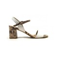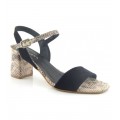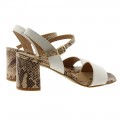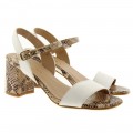 Sandalia de tacón Tiziana modelo 1302 en color negro o blanco para mujer. Corte con pala lisa de ante o piel que combina con print serpiente en el tacón y pulsera del tobillo, forro interior de piel y cierre mediante hebilla lateral en el tobillo, tacón de 7 cm de altura con forro print serpiente, suela sintética muy ligera y flexible.