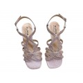 Corte realizado en material sintético con detalles de brillos al tono, plantilla acolchada para mayor confort, cierre de hebilla ajustable a la altura del tobillo, tacón geométrico de 9.5 cm de altura forrado al tono y suela sintética muy flexible y adherente.