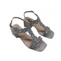 Corte realizado material textil efecto serraje con detallle de pedrería en tono plateado, plantilla acolchada para mayor confort, cierre mediante hebilla ajustable en el lateral y tacón cuadrado con una altura de 6 cm, la suela es sintética muy ligera.