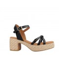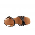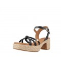 Corte realizado en material simil piel con detalle de nudo central de la tiras del empeine, plantilla acolchada muy confortable, cierre mediante pulsera en el tobillo con hebilla ajustable, tacón de 7cm con plataforma de 3.5cm y suela sintética de gran adherencia.