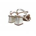 Corte realizado en piel metalizada con detalle de flor en la tira central, plantilla acolchada new gel para mayor comodidad, cierre mediante pulsera con hebilla ajustable a la altura del tobillo, tacón ancho de 6.5 cm de altura y suela de goma para mayor adherencia.