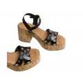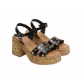 Corte fabricado en piel con detalle de tachuelas, plantilla acolchada de piel muy confortable con buena transpiración, cierre mediante pulsera de piel con hebilla ajustable que ofrece una buena sujeción, tacón de 8.5 cm y plataforma de 3.5 cm con suela de material sintético de gran adherencia.