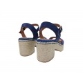 Corte realizado en piel serraje azul con plantilla de piel vegana acolchada para mayor confort, cierre mediante pulsera en el tobillo con hebilla ajustable, tacón de 8 cm y plataforma de 4 cm en yute natural, la suela es de material sintético muy ligera. Hecho en España.