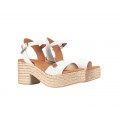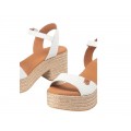 Corte realizado en piel natural en trenzado blanco con plantilla de piel vegana acolchada para mayor confort, cierre mediante pulsera en el tobillo con hebilla ajustable, tacón de 8 cm y plataforma de 4 cm en yute natural, la suela es de material sintético muy ligera. Hecho en España.