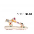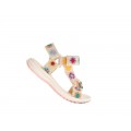 Corte realizado en material textil con flores crochet, forro textil con plantilla antibacterias y de buena amortiguación, cierre mediante doble velcro y suela de goma muy flexible y adherente.