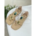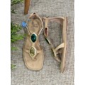 Sandalia plana de dedo Alma en Pena V22BL2041 en color beige para mujer. Corte realizado en ante con detalle de piedras multicolor, forro interior de piel con plantilla en ante, cierre mediante cremallera en el talón y suela sintética muy ligera y adherente.