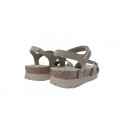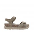 Corte realizado en piel nobuck kaki con ajuste mediante velcro, forro interior de piel con plantilla anatómica, cierre mediante velcro ajustable, suela de poliuretano con una altura de 4.5 cm. Fabricación española.