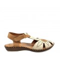 Corte realizado en piel natural con puntera cerrada con calados que favorecen una buena transpiración, forro interior de piel con plantilla acolchada forrada en piel, cierre mediante pulsera en el tobillo con ajuste de velcro, cuña baja de 3 cm y suela de goma muy adherente.
