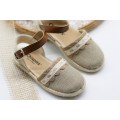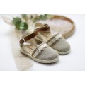 Alpargata para niña Chispas modelo Lino Provenza-D86 en color tostado-beige. Pala textil con detalle de volante en la pala, forro interior textil con plantilla acolchada y fácil de lavar, cierre mediante hebilla ajustable con correa en tono cuero y suela de caucho adherente y flexible revestida de yute.