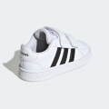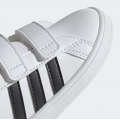 Deportivo unisex Adidas Grand Court I modelo EF0118 en color blanco con negro. Corte realizado en piel sintética con tres bandas en color negro haciendo contraste, forro textil con plantilla acolchada extraíble para una mejor limpieza e higiene, cierre mediante doble velcro y suela de goma muy adherentre y flexible.