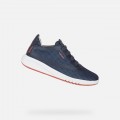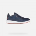 Deportivo Aeranter de Geox modelo J04BNB en color azul para niño. Corte fabricado en material textil que combina el azul con detalles en rojo, forro interior textil con plantilla de piel extraíble antibacteriana y libre de cromo, el cierre es mediante cordones elásticos, suela de EVA ligera, flexible, amortiguada y de adherencia eficaz. La transpirabilidad de la suela y el bienestar del pie están asegurados por el sistema patentado Geox.