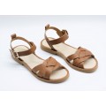 Sandalia de piel Beberlis modelo 21918-B en color cuero. Fabricada en piel natural con pala de tiras cruzadas y detalle de lazada en el tobillo con motivos florales de quita y pon, forro de piel con plantilla acolchada, cierre mediante hebilla y suela de goma muy flexible y adherente.