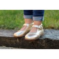 Mercedes de la marca Beberlis modelo 19312 en color dorado para niña. El corte está hecho en piel con acabado satinado, forro interior y plantilla de piel que garantizan una correcta transpiración, cierre mediante hebilla ajustable y suela de goma muy flexible y adherente para evitar resbalones. Un modelo que proporciona un buen ajuste al caminar ayudando en sus primeros pasos.