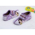 Zapatilla de casa cerrada Chispas modelo 10112 en color morado para niña. Corte fabricado en material textil con detalle de princesa, forro interior textil aterciopelado muy transpirable y calentito, cierre de velcro y suela de caucho que proporciona gran adherencia.