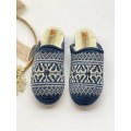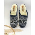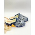 Zapatilla de casa descalza con cuña Wamba 200136 en color azul para mujer. Corte realizado en material textil con bordados, forro interior de borreguito muy calentito y de tacto muy suave, cuña de 4 cm y suela de caucho vulcanizado muy adherente.