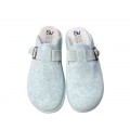 Corte realizado en fieltro con detalle de hebilla, forro interior textil aterciopelado con plantilla extraíble memory foam, la suela es sintética antideslizante y flexible.