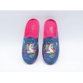 Zapatilla de casa descalza Chispas modelo Janeiro-503 en color tejano para niña. Corte fabricado en material textil con grabado de unicorno y estrellas con glitter en la pala, forro interior textil muy transpirable con suela de caucho adherente.
