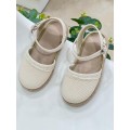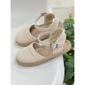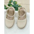 Alpargata para niña Calzados Gayoso modelo 458-031 en color beige o verde agua. Pala textil con detalle de volante en la pala, forro interior textil con plantilla acolchada y fácil de lavar, cierre mediante hebilla ajustable y suela de caucho adherente y flexible revestida de yute.